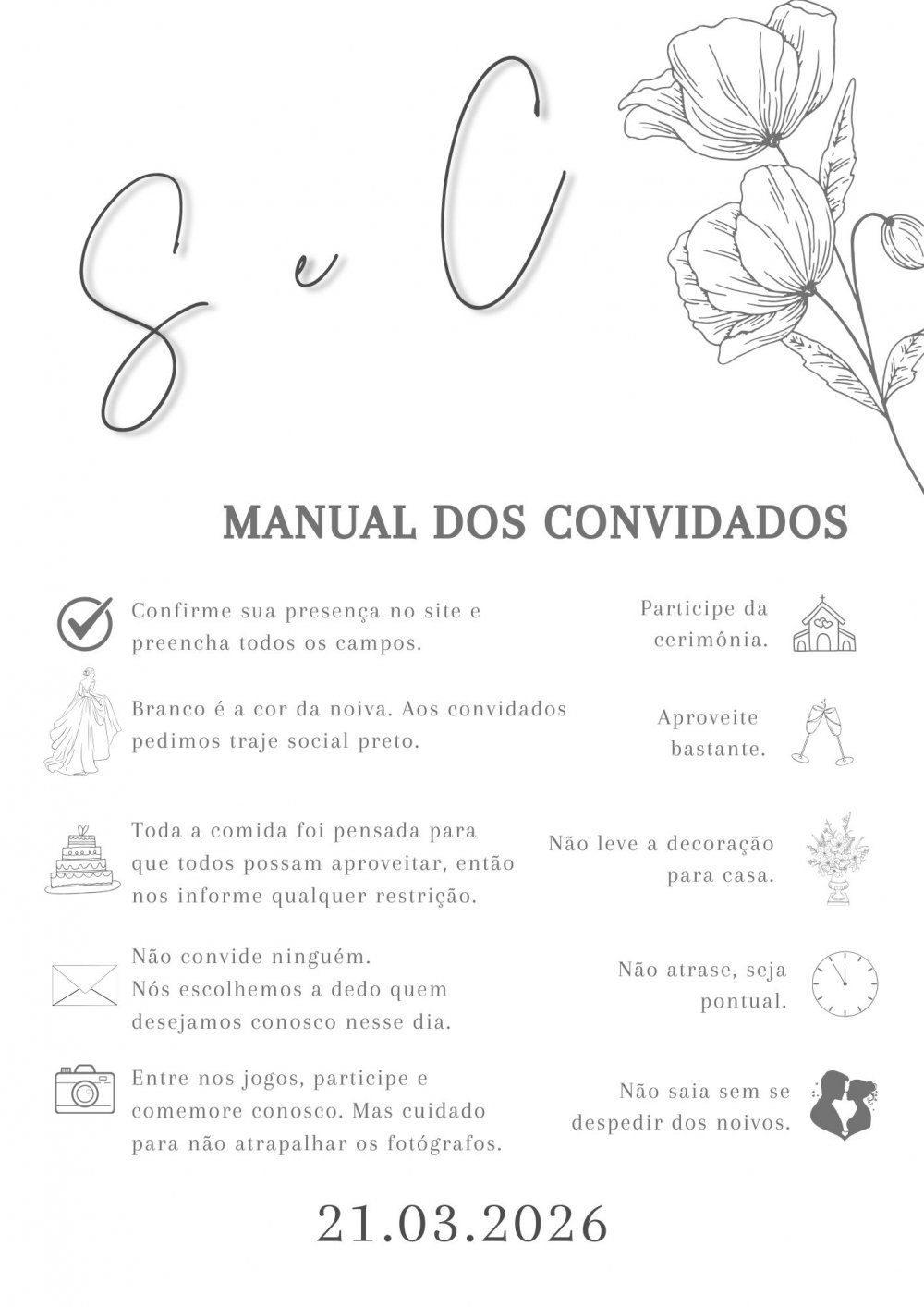 Criamos esse site para compartilhar com vocês os detalhes da organização do nosso casamento. Estamos muito felizes e contamos com a presença de todos no nosso casamento! Aqui vocês encontrarão também dicas para o dia. Ah, é importante também confirmar sua presença. Para isto contamos com sua ajuda clicando no menu “Confirme sua Presença” e preenchendo os dados necessários. Para nos presentear, escolha qualquer item da Lista de Casamento. Fiquem à vontade! Esperamos vocês no nosso grande dia!